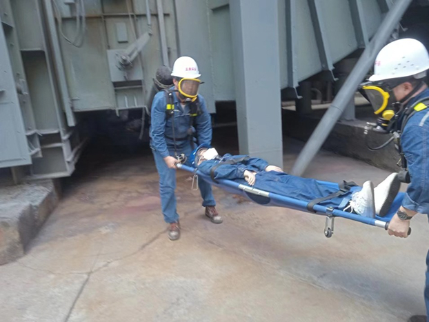 應(yīng)急演練開始,安全員趙開寶對(duì)本次演練內(nèi)容進(jìn)行了講解,并對(duì)參與本次演練的員工進(jìn)行了分工。本次演練內(nèi)容為:3燒脫硫系統(tǒng)運(yùn)行中,進(jìn)口煙道附近巡檢人員巡檢時(shí)發(fā)現(xiàn)有1名人員暈倒在煙道附近,同時(shí)煙道底部有白色煙霧漏出,懷疑是發(fā)生二氧化硫中毒,隨即向當(dāng)班班長匯報(bào)。當(dāng)班班長在1分鐘內(nèi)通知生產(chǎn)部相關(guān)負(fù)責(zé)人,同時(shí)聯(lián)系燒結(jié)機(jī)對(duì)抽煙機(jī)及脫硝風(fēng)量進(jìn)行調(diào)整加大煙道負(fù)壓減少泄漏源,立即組織現(xiàn)場(chǎng)人員對(duì)泄漏50米范圍內(nèi)進(jìn)行警戒隔離防止無關(guān)人員進(jìn)入泄漏區(qū)域;并立即組織2名應(yīng)急救援人員穿戴好空氣呼吸器進(jìn)入事故現(xiàn)場(chǎng)進(jìn)行施救,救援人員來到現(xiàn)場(chǎng)后在1分鐘內(nèi)穿戴好空氣呼吸器進(jìn)入泄漏區(qū)域用擔(dān)架將暈倒的人員轉(zhuǎn)移到人孔外,被救出的人員呼吸正常,意識(shí)清醒,出現(xiàn)身體乏力伴有嘔吐情況,經(jīng)過周邊空氣檢測(cè),靠近煙道口附近溫度比較高,且發(fā)現(xiàn)一處煙道漏點(diǎn),附近氣流不通暢,二氧化硫超標(biāo),隨即對(duì)人員補(bǔ)充水分并安置在通暢處歇息,安排急救車送往醫(yī)院。生產(chǎn)部管理人員對(duì)現(xiàn)場(chǎng)實(shí)際情況作出初步判斷,同時(shí)檢修人員穿戴空呼對(duì)漏點(diǎn)處進(jìn)行焊補(bǔ)。