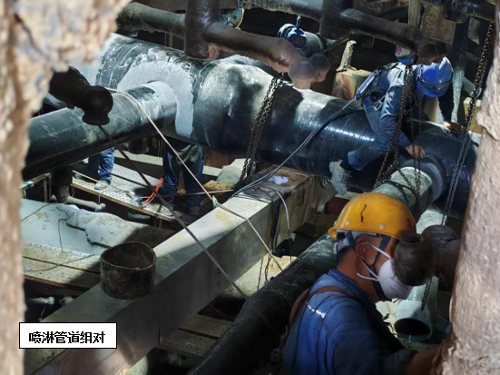 維修方案確定后,攀藍鼎立即開始著手噴淋管道采購預(yù)制工作,考慮到目前燒結(jié)產(chǎn)能不飽和,系統(tǒng)多處停機的因素,決定預(yù)制管道到廠后由檢修進行拆除及更換,只保留技術(shù)性要求較高的玻鋼粘接由專業(yè)施工人員來完成。7月24日,在材料到廠后,檢修立即開始在塔內(nèi)布置安全措施,并進行噴淋層打拆工作,打拆過程中檢修對切下的三通支管進行仔細甄別,磨損嚴(yán)重的進行報廢處理,還具備使用價值的作為備件歸置,以確保物盡其用。打拆完畢后,檢修隨即進行管道吊裝及內(nèi)部組裝配管工作,配管完成后防腐單位開始進場作業(yè),在此過程中檢修全程安排人員進行組對及工程質(zhì)量監(jiān)督工作,并及時撤場收尾。